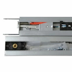 Darüber hinaus sind die stabile Zahngurtkupplung, die automatische Spannvorrichtung und auch der Führungsschlitten für höchste Ansprüche, eine lange Lebensdauer und Funktionsfähigkeit ausgelegt. Die eigentliche Antriebsschiene besteht aus verzinktem, hochwertigem Stahl, wird mittig geteilt und durch ein Klappscharnier zusammengehalten.
