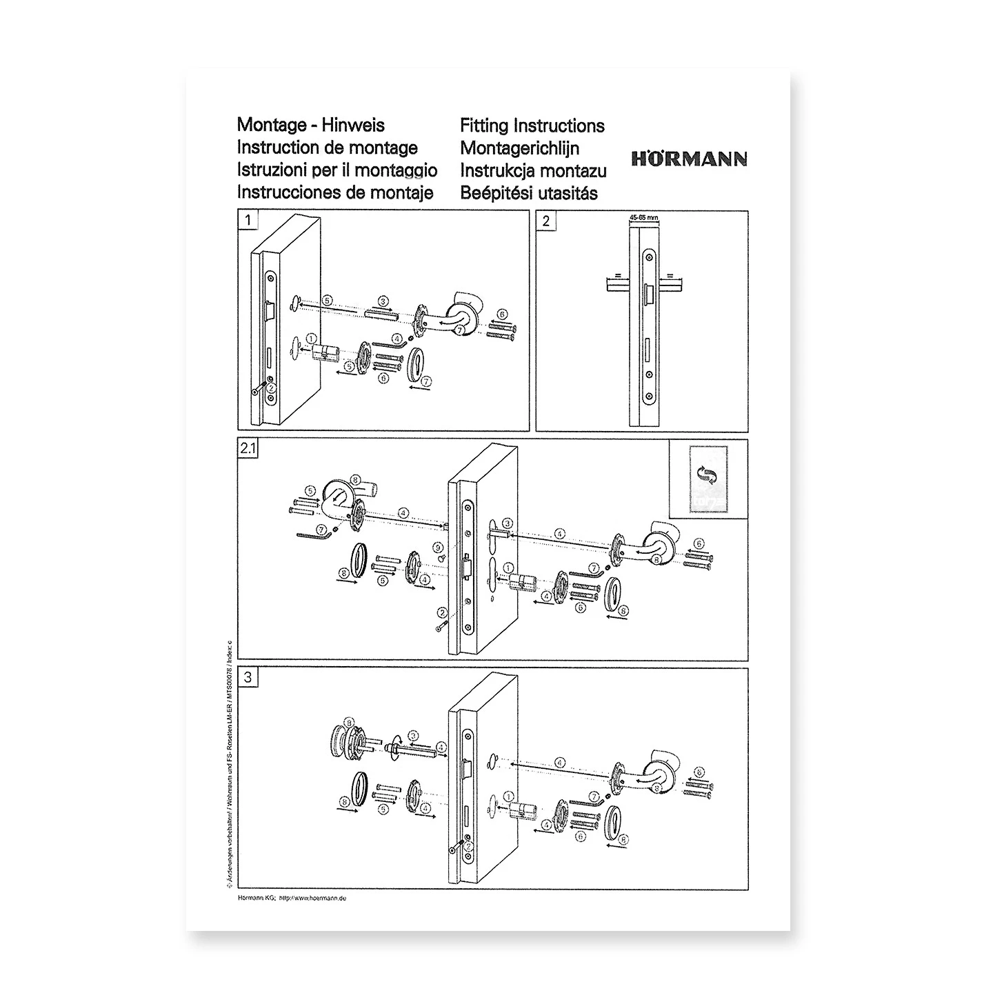 - Fremdfabrikate mit Türblattstärke zwischen 45 und 65 mm, Vorrichtung für Rosettengarnituren und 9 mm Schlossnuss