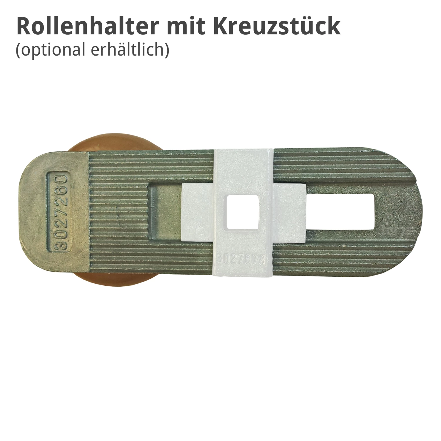 Für die Befestigung wird eine Hörmann Flachrundschraube M8 x 22, verzinkt (Artikelnr. 3035719) sowie eine Hörmann Sechskantmutter M8 mit Hohlflansch (Artikelnr. 3018270) benötigt, die auf Anfrage bestellt werden können. Das optional erhältliche Hörmann Kreuzstück für Rollenhalter erleichtert dabei die Montage an der Garage. Dieser Rollenhalter mit der Gussteilnummer 3027260 konnte früher auch unter den Artikelnummern 3027279 oder 3040333 bestellt werden.