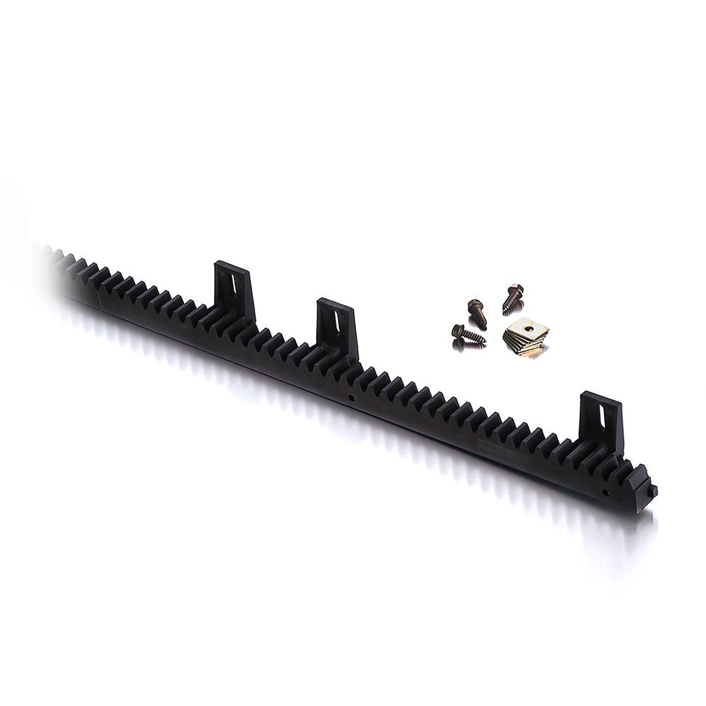 Jede Zahnstange ist 1 Meter lang und zur Anbringung am Torflügel mit 6 nach unten weisenden Befestigungslaschen versehen. Für deren Befestigung werden auch die passenden Schrauben und Unterlegplatten mitgeliefert. Die Kunststoffzahnstangen sind in Schwarz eingefärbt und durch einen im Inneren befindlichen Stahlkern stabilisiert. So werden die Vorteile beider Materialien miteinander verbunden. Kunststoffzahnstangen zeichnen sich etwa durch ihre Laufruhe aus, während Stahl anderseits deutlich stabiler ist. So läuft Ihr Schiebetor mit einer SOMMER Kunststoffzahnstange mit Stahlkern deutlich leiser, als wenn Stahlzahnstangen eingesetzt würden. Trotzdem sind die Bauteile aber so stabil, dass sie an Toren bis 600 kg eingesetzt werden können.